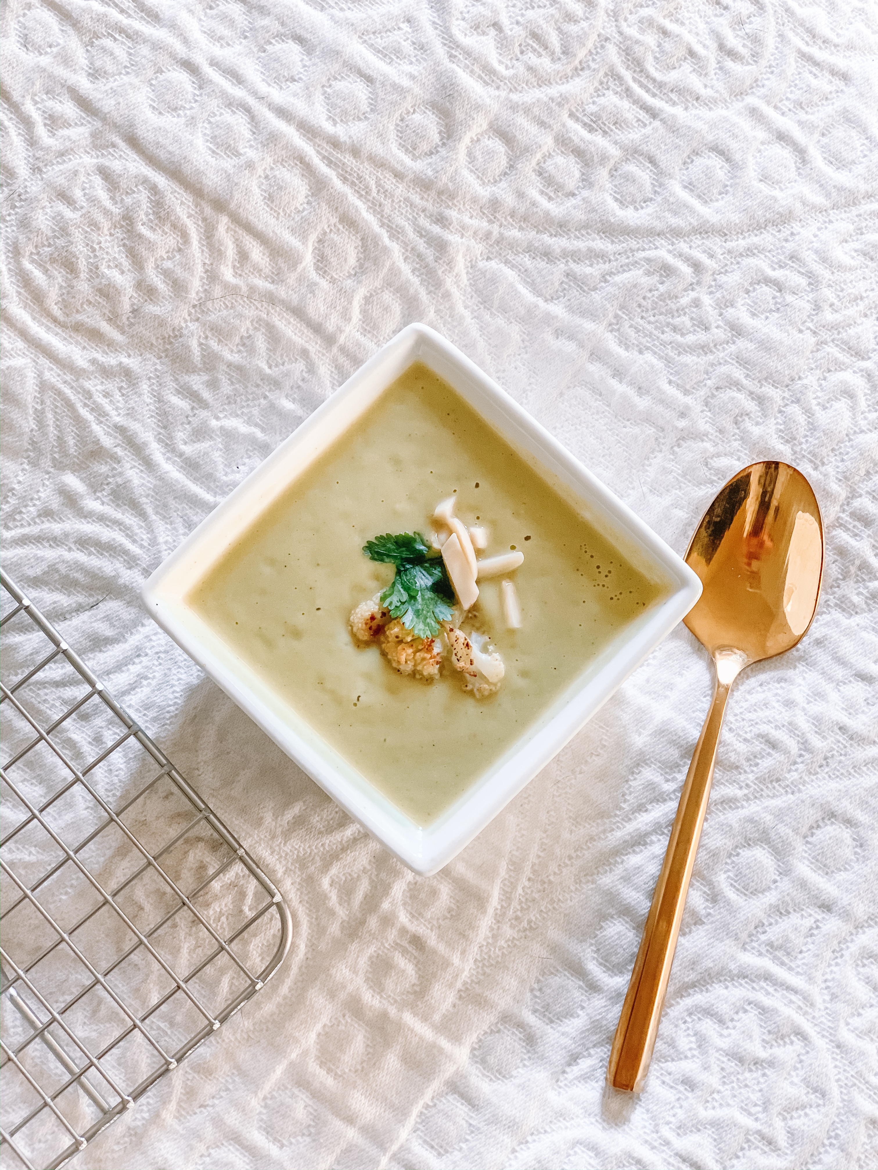 Garnish with a couple of roasted florets (if you saved any), blanched almonds & cilantro