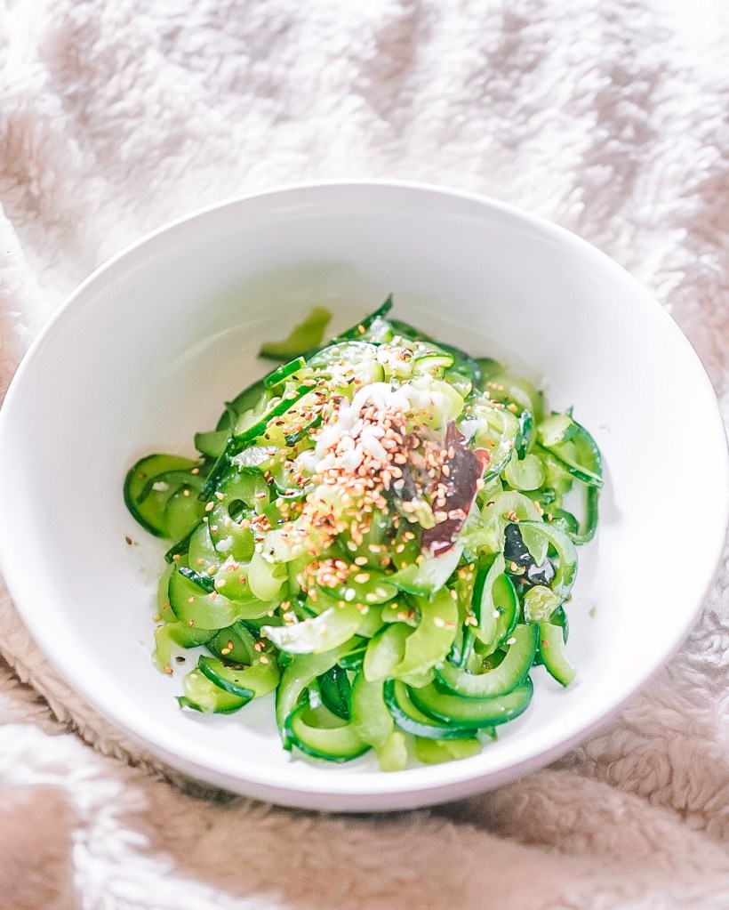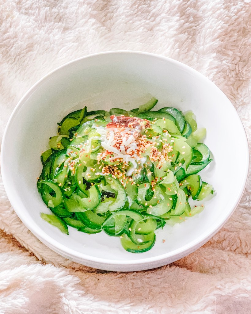 Spiralize the 2 cucumbers using a standard spiralizer (I recommend the broader blades rather than angel hair blades)